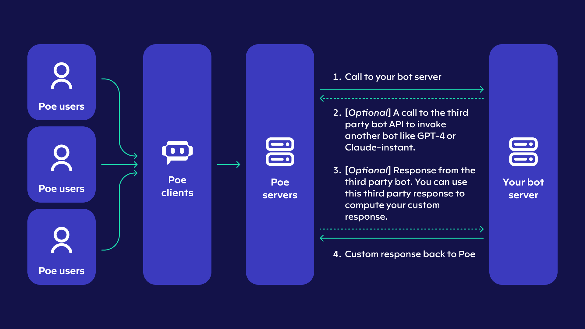 In this quick start guide, we will build a bot server in Python and then integrate it with Poe. Once you have created a Poe bot powered by your server, any Poe user can interact with it. The following diagram might be useful in visualizing how your bot server fits into Poe.