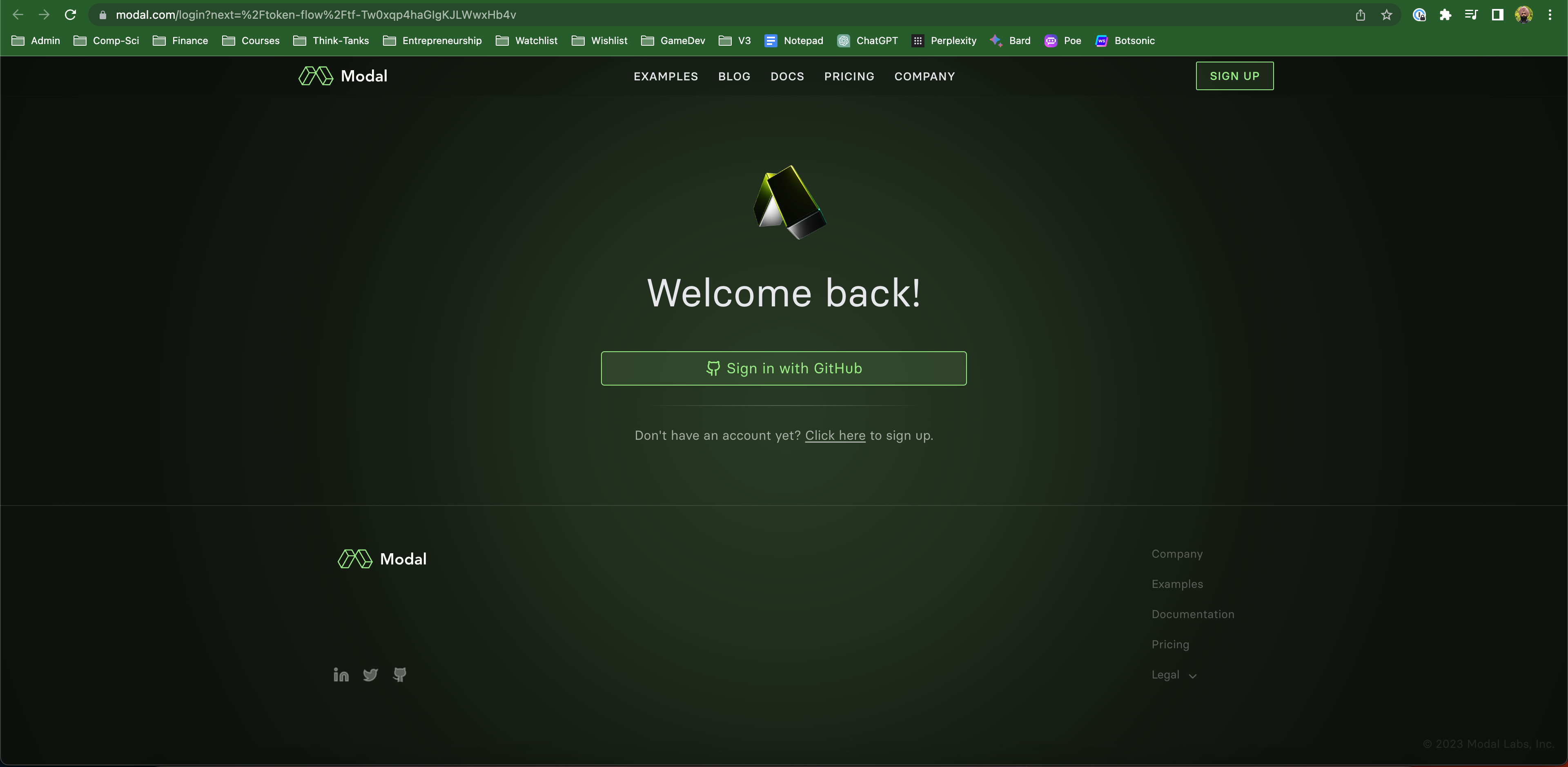 If that command runs successfully, you will taken to your web browser where you will be asked to log into modal using your Github account.